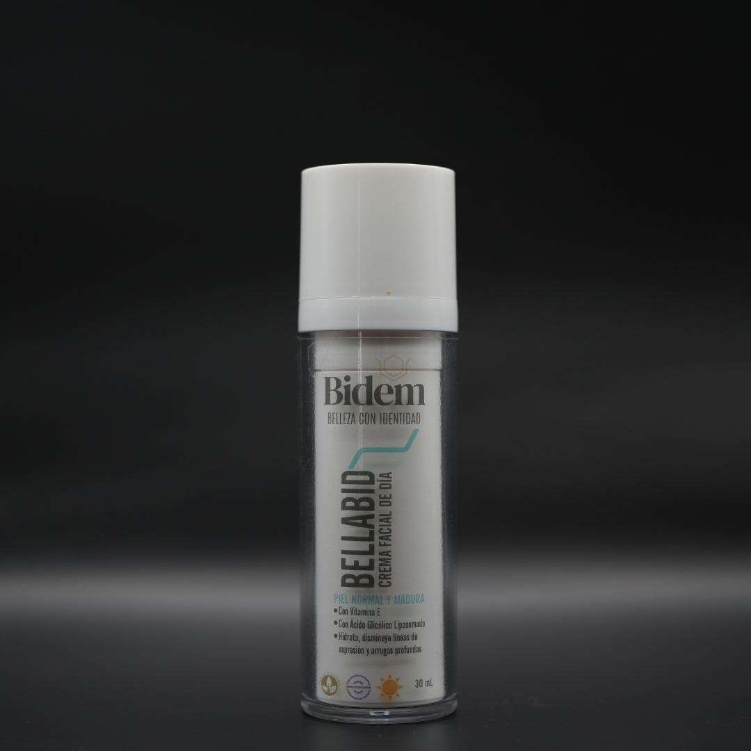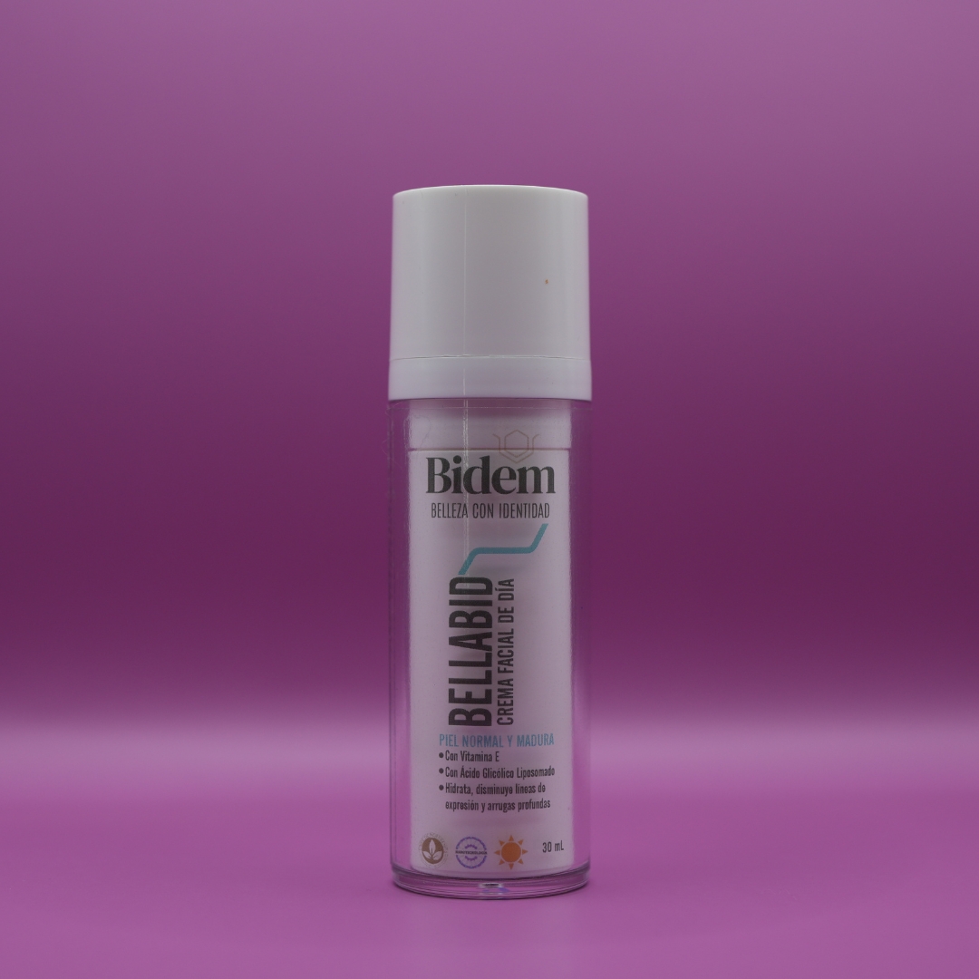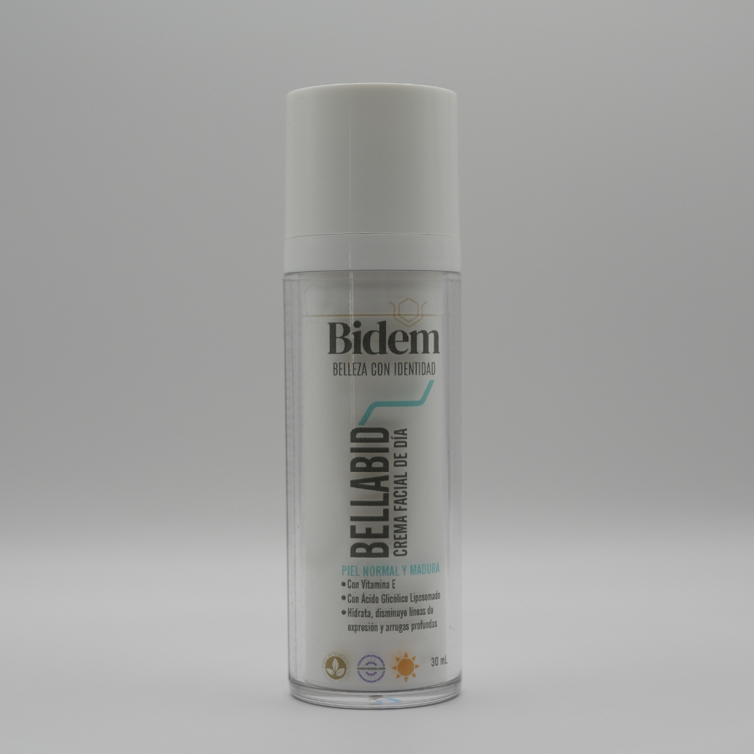 BELLABID es una crema facial de día especialmente formulada para piel normal y madura, que combina ácido glicólico liposomado y ácido hialurónico en una fórmula libre de parabenos, diseñada para hidratar, renovar y proteger la piel, manteniendo una apariencia joven y saludable.
