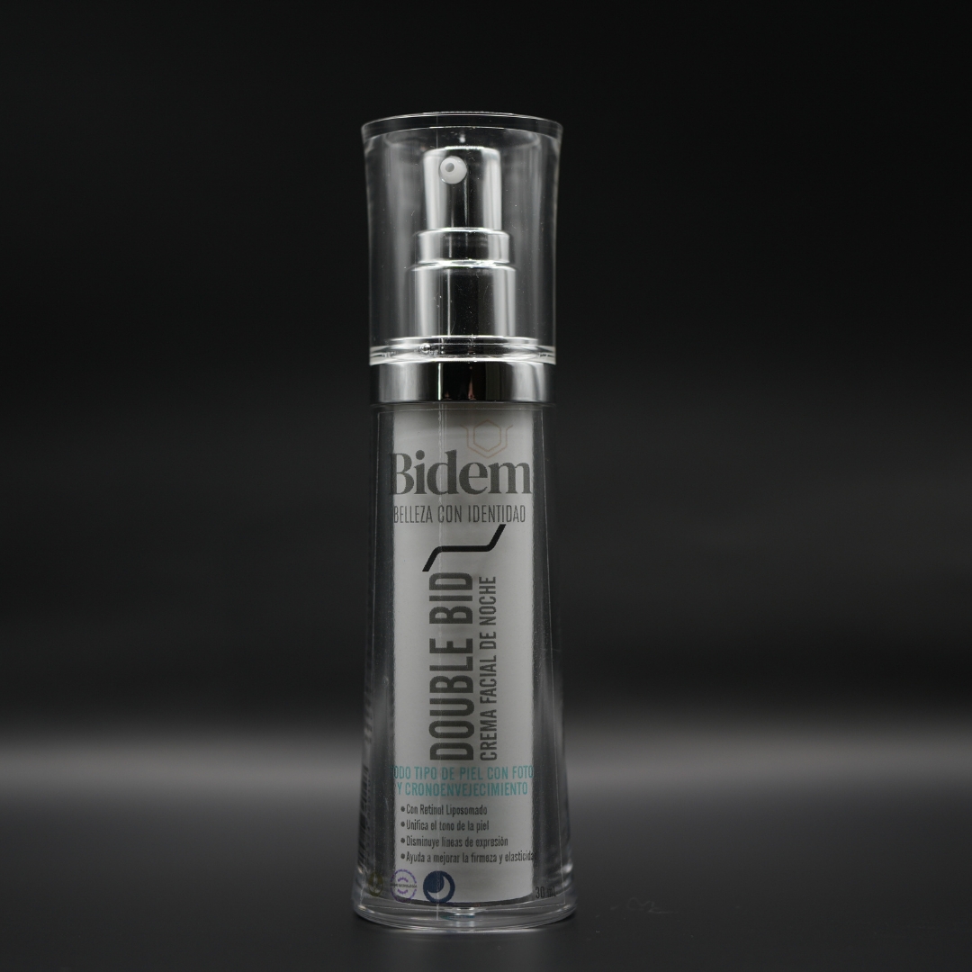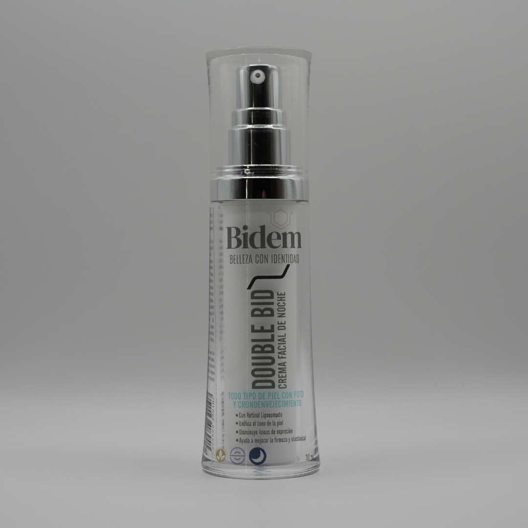 DOUBLE BID es una crema facial de noche formulada para todo tipo de pieles que combaten los signos del foto y cronoenvejecimiento. Su fórmula avanzada integra ingredientes activos que favorecen la regeneración, firmeza y nutrición celular durante el descanso nocturno.